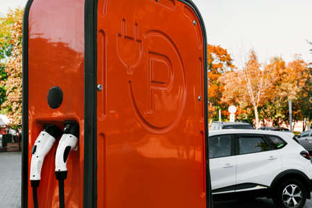 EV charging station for electric car in city. Concept of green energy and eco technologies.