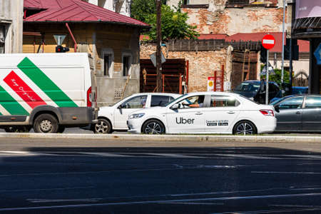 Uber car in traffic at rush hour. Car pollution, traffic jam in the morning and evening in the capital city of Bucharest, Romania, 2020