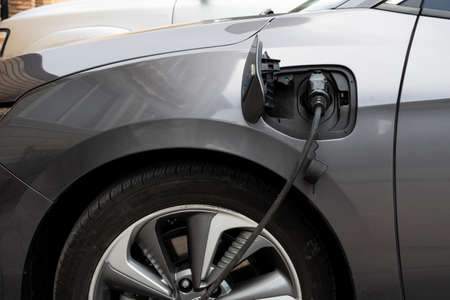 The process of charging an electric car close up.