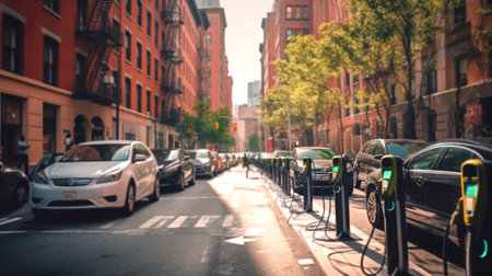 An AI generated illustration of a street in New York City with charging stations for electric car