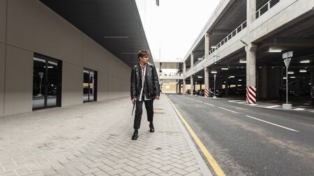 Stylish young man in an oversize leather jacket in vintage trousers in cool boots with a fashionable black backpack walks on the street near the parking lot. Attractive guy in trendy clothes outdoors.
