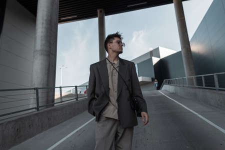 Handsome young businessman guy with sunglasses in a fashionable gray suit with a handbag walks in the city near a modern building