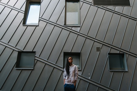 Portrait of serious black sportswoman on city area