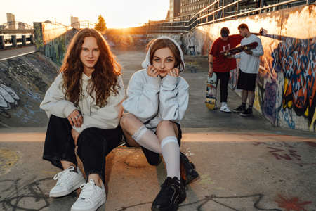 Attractive girlfriend in stylish casual clothes drinking wine outdoors on a background of cityscape and posing at camera. Girls sit on the grass and drink white wine from a bottle, looking in camera.