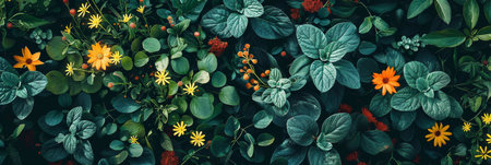 A vibrant and lush arrangement filled with green leaves and bright, colorful flowers, showcasing the beauty of nature