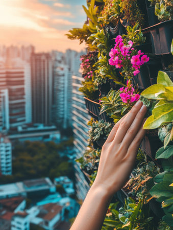 Hand Touching Vibrant Pink Flowers Urban Rooftop Garden Sunset Cityscape wall view life green bloom