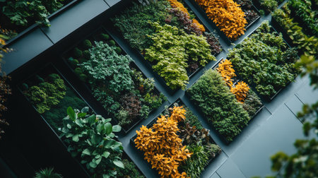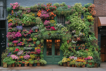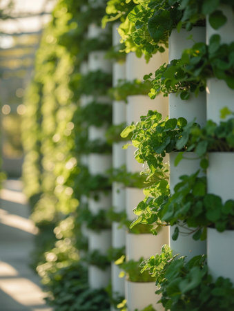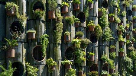 A close-up of a vertical garden on the side of an eco-friendly commercial building, with plants thriving in the urban environment