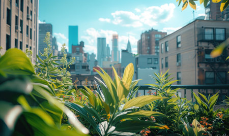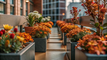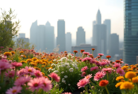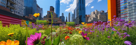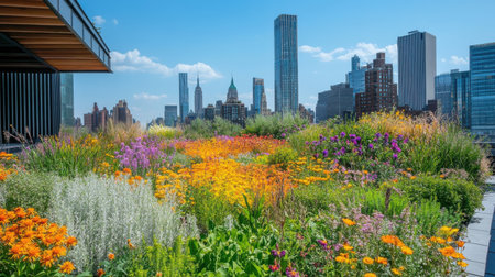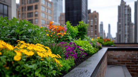 vibrant flower rows in a rooftop garden offer a serene escape from city hustle, embodying the concept of urban green space