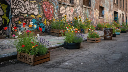 A charming urban alleyway showcases a collection of planter boxes and potted plants, including sunflowers, poppies, and lavender, providing a splash of greenery and color against a backdrop of vibrant street art and graffiti. This scene highlights urban gardening and community beautification, blending nature with city life. Outdoor setting with diverse flora and artistic wall.