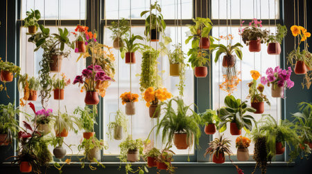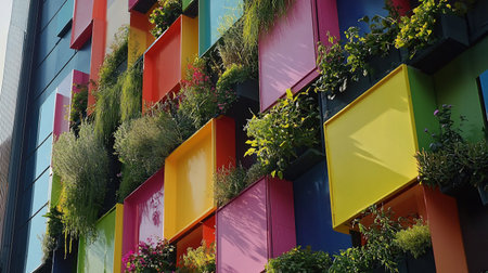 A visually appealing display of colorful wall planters filled with various green plants, creating a lively and artistic facade.