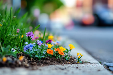 A photograph of colorful flowers growing in the dirt on a street corner, with a blurry background and a Lego flower model. --ar 3:2 --v 6.1 Job ID: 6be51d6b-519d-4ee5-a165-d43da7d43294