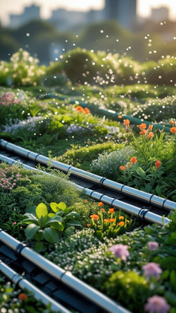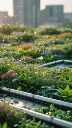 Rooftop garden featuring vibrant flowers, greenery, and irrigation pipes under soft morning sunlight. Urban skyline blurred in the background, creating a serene atmosphere.