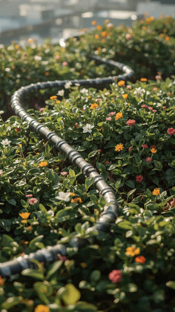 Close-up of a garden irrigation hose snaking through lush green plants adorned with yellow, pink, and white flowers. Sunlight enhances the natural setting.