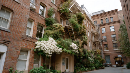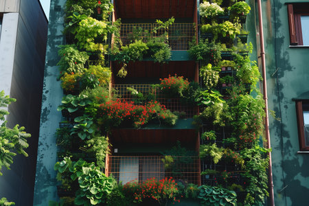 Vertical Garden Blooms on Urban Apartment Building in Bright Sunlight