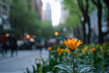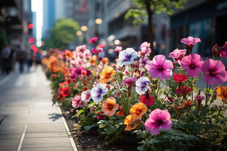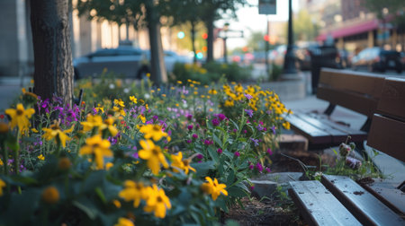 Lively urban garden featuring colorful flowers and trees amidst modern buildings in a busy city street