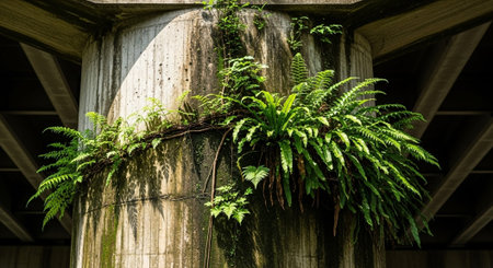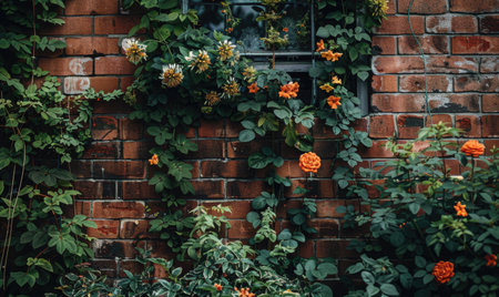 AI generated a plant growing on a wall in the city. The image features plant growing, brick wall, green leaves. Additional elements include flowers bloom, minimal background.