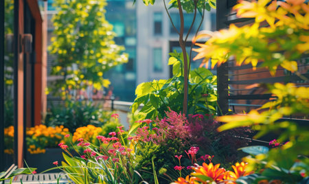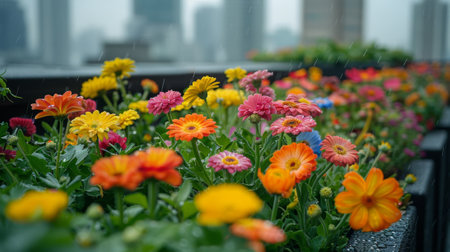 Vibrant rooftop garden featuring diverse blooming flowers, greenery, and water droplets under soft sunlight. Urban buildings in the background enhance the contrast.