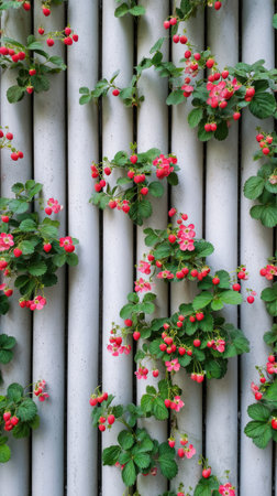 This image showcases a wall with vertical white elements, adorned with climbing plants bearing red berries and green foliage. The composition features a repeating pattern with bright colors. It could be suitable for various commercial purposes, including decorative elements or natural themes in different projects.