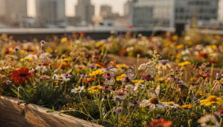 Focused view on a cluster of butterflies resting on flowers in a dense wildflower garden raised beds on rooftop with indistinct cityscape beyond.