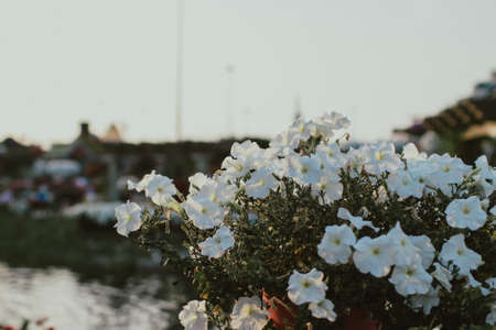 White blooming flowers in a pot that grow in the garden on the street with floral background