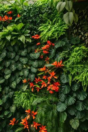 Vertical Garden with Lush Greenery and Vibrant Red Flowers.