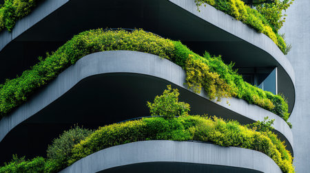 Green architecture. Skyscraper building with plants growing on facade. Vertical green plants growing on tall building wall, bringing life and beauty to the urban environment. Sustainable living wall