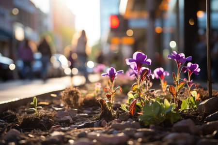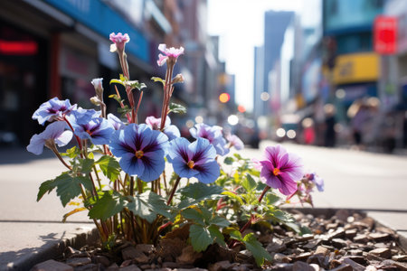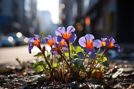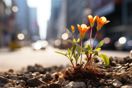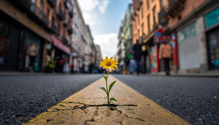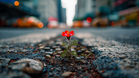 A striking crimson bloom pushes through cracked pavement, symbolizing resilience amid urban decay in a lively cityscape scene.