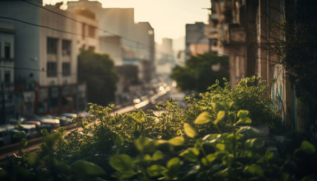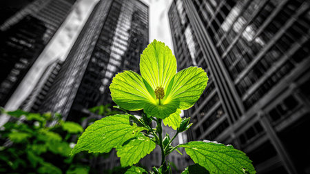 The a close-up of fresh green leaves in the foreground, glowing brightly in the sunlight. The leaves are sharp and in focus, while the background a blurred city skyline with tall buildings and a street scene. The sunlight creates a warm, vibrant glow on the leaves, contrasting with the cool tones of the urban environment. The composition highlights the juxtaposition of nature and urbanization, with the natural greenery in sharp focus against the blurred cityscape.