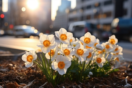 Beautiful flowers with buildings in background. Urbanization and sustainable environment concept