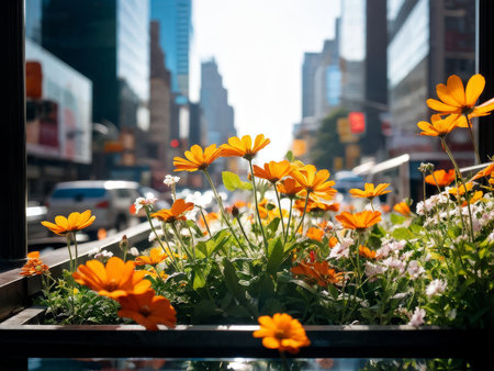 Colorful wildflowers in decorative planter on balcony with city skyline. That the image is generated using AI.