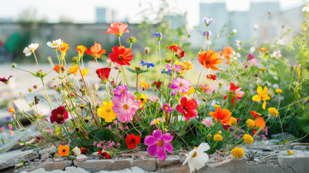 A stunning array of vibrant wildflowers bursts into life from cracks in concrete, showcasing nature's resilience and beauty in an urban setting.