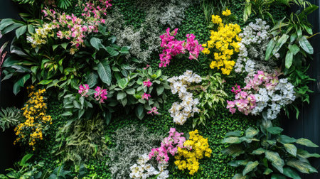Lush green wall filled with vibrant pink, yellow, and white flowers in full bloom, captured in soft daylight