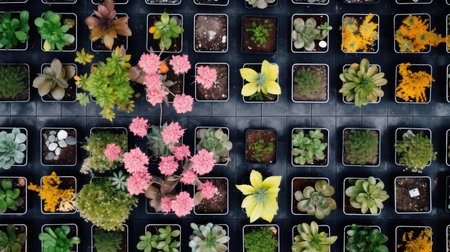 An aerial perspective showcases a stunning array of colorful flowers in pots lining the street, reflecting nature's diversity and beauty.
