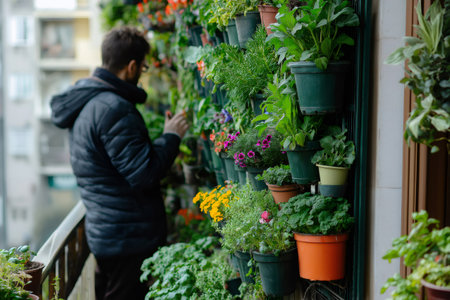 Gardener tending to an urban balcony garden filled with vibrant plants, flowers, herbs, and vegetables in a lively city apartment