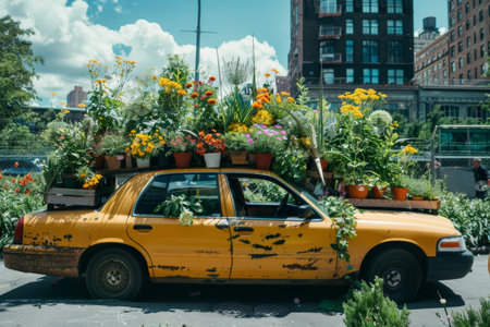 Old yellow taxi cab converted into a vibrant mobile garden on city street, urban greening and sustainability concept.