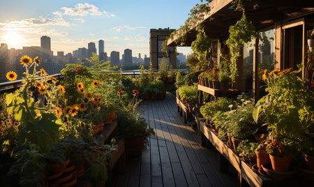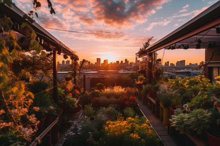 A vibrant rooftop garden in a bustling city at sunset, AI-generated.