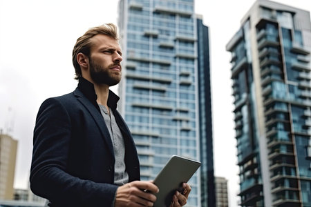 Europe Young businesman with laptop , tall building background , copy space,Generative AI.