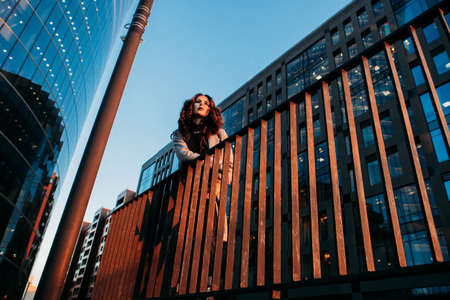 Portrait of a curly-haired mulatto traveler in a yellow jacket and with a backpack in the city. Traveling alone is a lifestyle. A young tourist is enjoying his autumn vacation.
