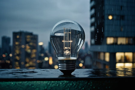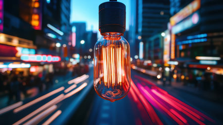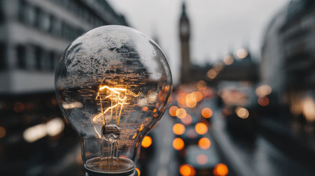 Glowing light bulb in foreground contrasts with blurred cityscape featuring iconic architecture in background. scene captures moody urban atmosphere, evoking creativity and inspiration