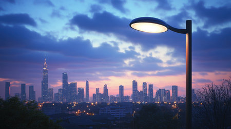 A stunning cityscape at dusk featuring a glowing street lamp, illuminating the vibrant skyline. Perfect for showcasing urban beauty and tranquility.