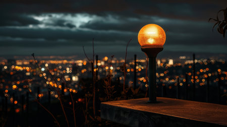 Glowing lamp stands on stone surface, casting warm light against backdrop of city lights at night. scene evokes sense of tranquility and urban beauty