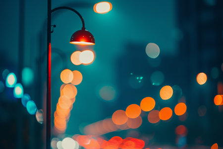 A charming vintage street lamp casts a warm glow in a bustling city, creating an enchanting scene with blurred bokeh lights that evoke a sense of tranquility and beauty.