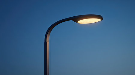 Close-up of a sleek modern streetlight pole equipped with energy-efficient LED lighting, symbolizing urban technology, smart cities, and innovation.
