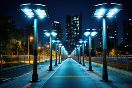 City of Lights: A modern street LED lighting pole illuminates the urban nightscape, blending eco-energy technologies with the vibrant city.