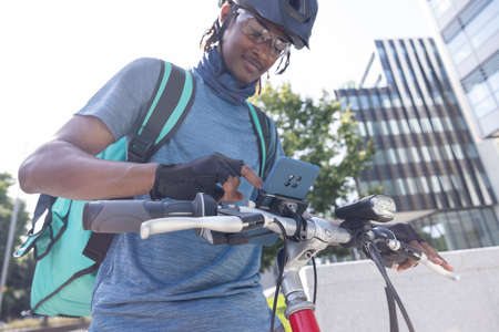 Courier On Bike Delivering Takeaway Food In City Checking Directions And Order Details On Mobile Phone
