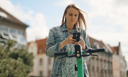 Woman's hands close up holding a phone near the modern city electric kick scooter, going to unlock it. Modern city transportation.