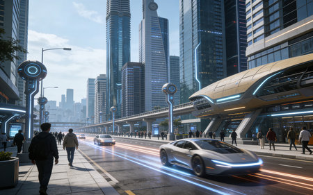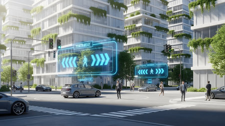Futuristic smart city intersection with holographic pedestrian guidance and green architecture