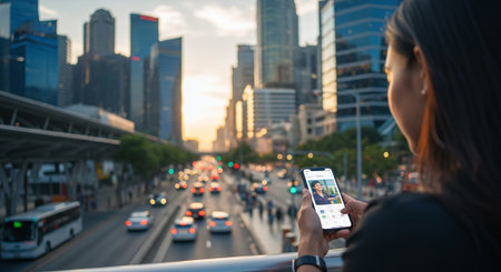 A person is holding a cell phone in a busy city street. Concept of urban life and the fast-paced nature of modern society. The presence of multiple cars, buses
