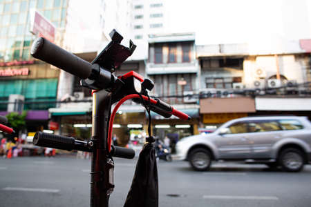 Electronic scooter beside the road.Gadget eco technology for drive near area for travel.Vechicle e-scooter for move around city.Modern ride enegy transport.