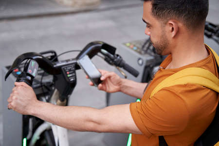 Young Latino man stands by the parking lot with a rental bike and uses a smartphone with a smile on his face. Eco-friendly transport concept